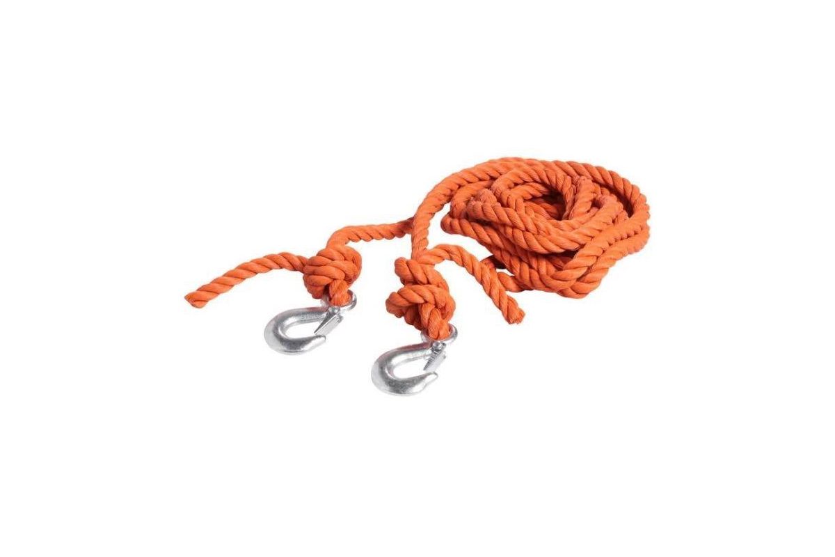 Буксировочный трос в форме каната оранжевого цвета изготовлен для транспортировки легковых машин и другой малогабаритной техники. Крепление троса к автомобилю обеспечивается за счет крюков из металла.