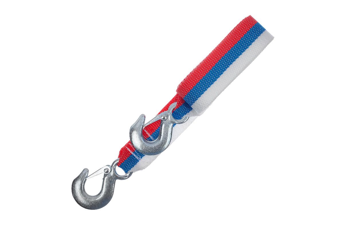 Трос представляет собой ленту, выполненную из прочной мультифиламентной нити, с двумя кованными стальными крюками повышенной прочности.