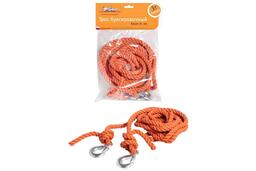 Буксировочный трос в форме каната оранжевого цвета изготовлен для транспортировки легковых машин и другой малогабаритной техники. Крепление троса к автомобилю обеспечивается за счет крюков из металла.