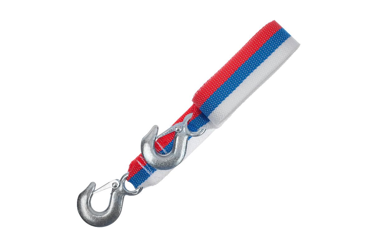 Трос представляет собой ленту, выполненную из прочной мультифиламентной нити, с двумя кованными стальными крюками повышенной прочности.