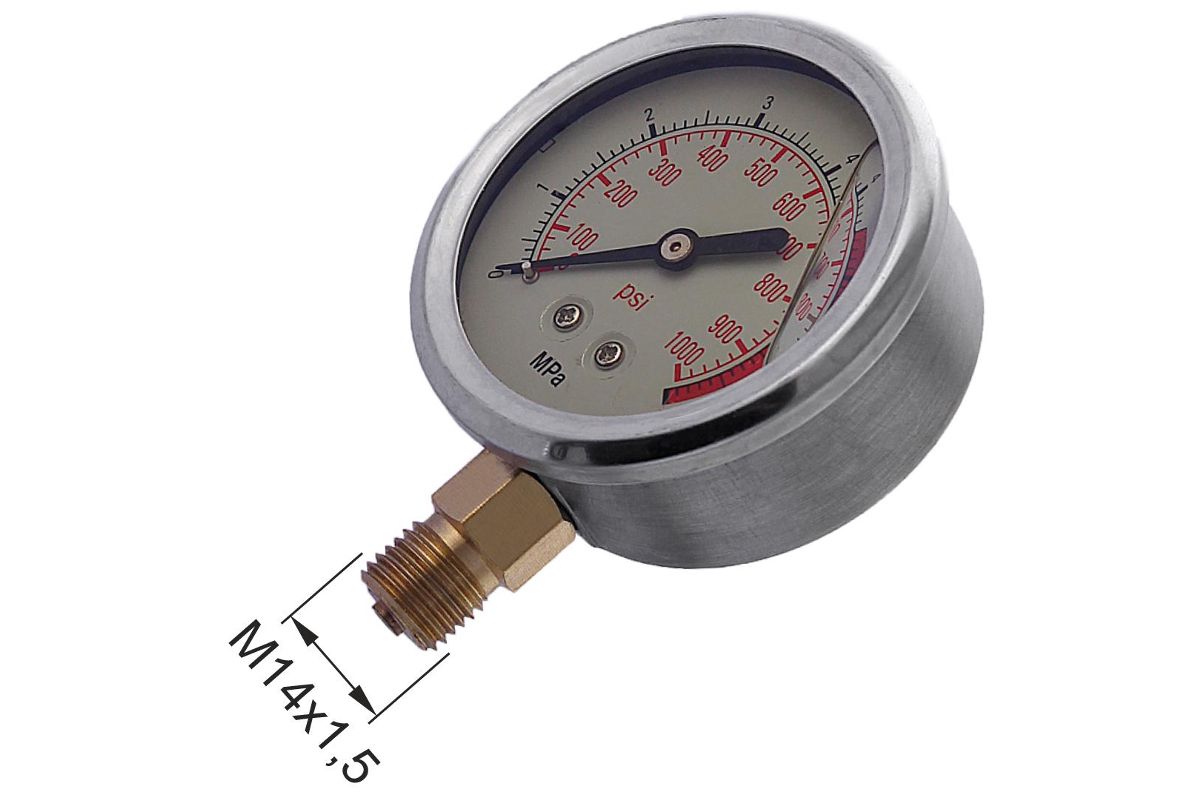 Маслозаполненный манометр предназначен для замены неисправного или повреждённого манометра на опресовочном насосе МЕГЕОН 98160, а также на другом технологическом оборудовании сторонних производителей. Копус изготовлен из стали и имеет нижнее крепление. Предельно измерямое давление составляет 7 МПа. Присоединительный размер резьбы М14х1,5.