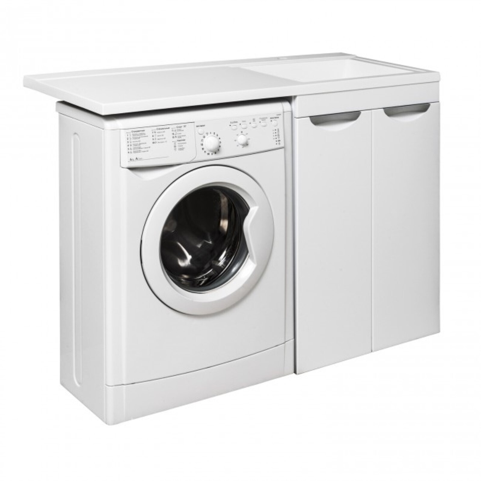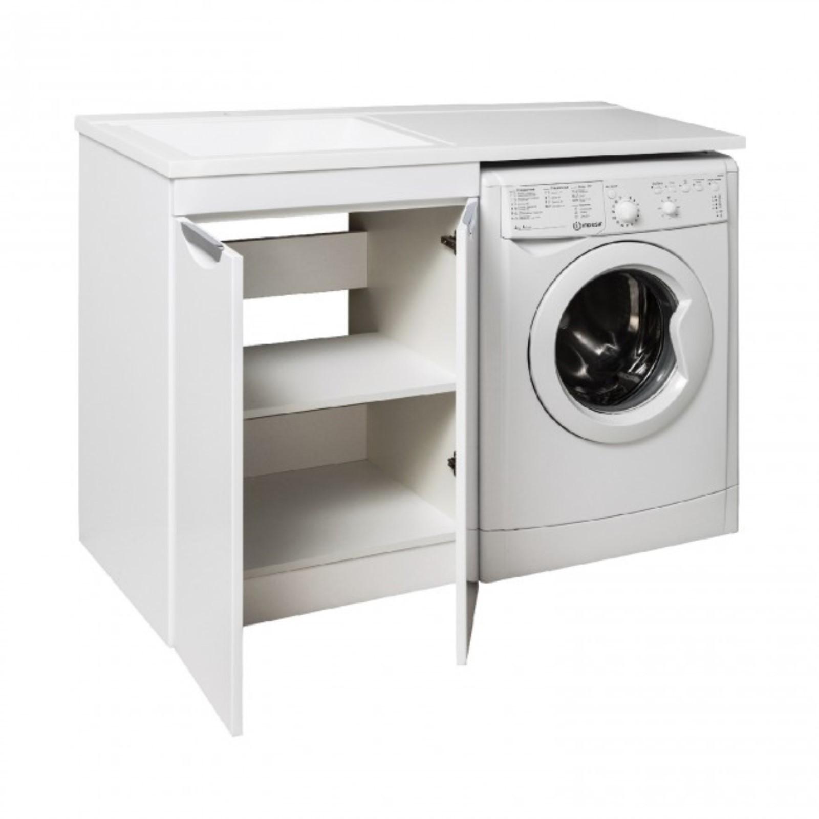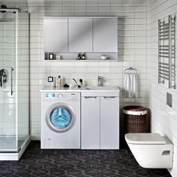 Комплект предусматривает установку стиральной машины размером 60х45х85 см под крылом умывальника слева от тумбы.