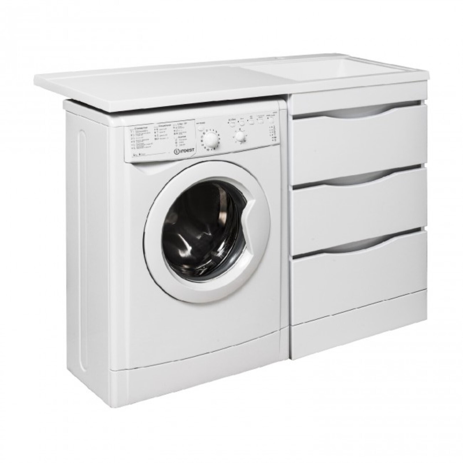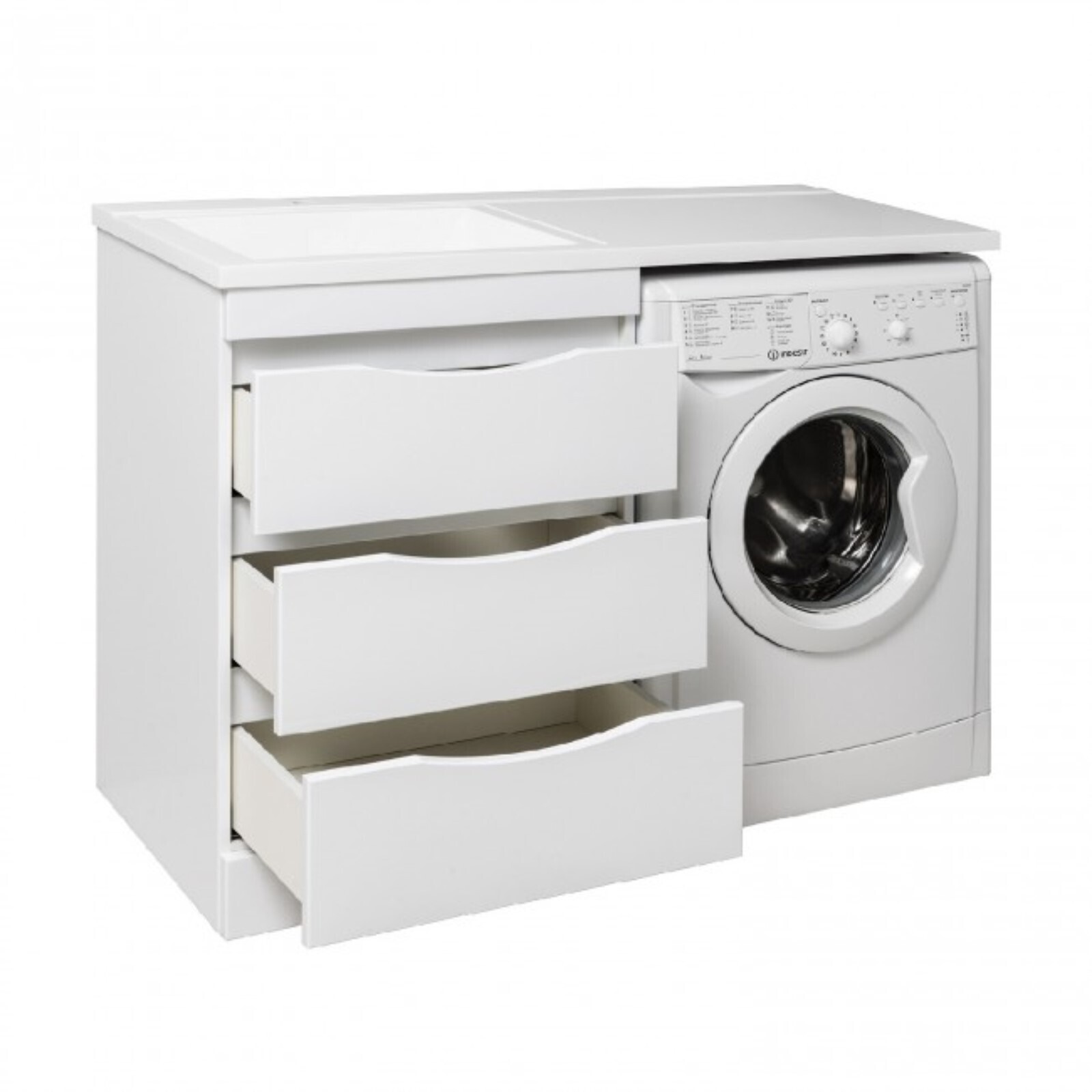 Комплект предусматривает установку стиральной машины размером 60х45х85см под крылом умывальника слева от тумбы.