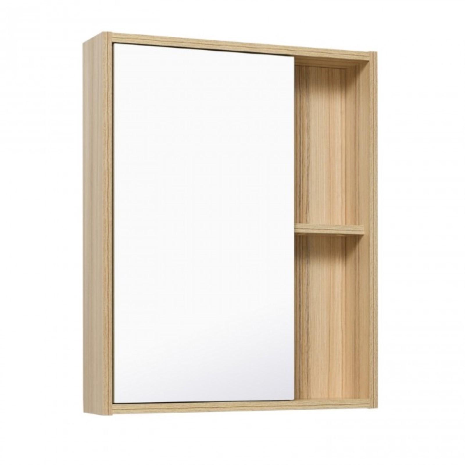 Зеркальный шкаф без подсветки с одной распашной дверкой и открытыми полками (слева или справа, зависит от установки).