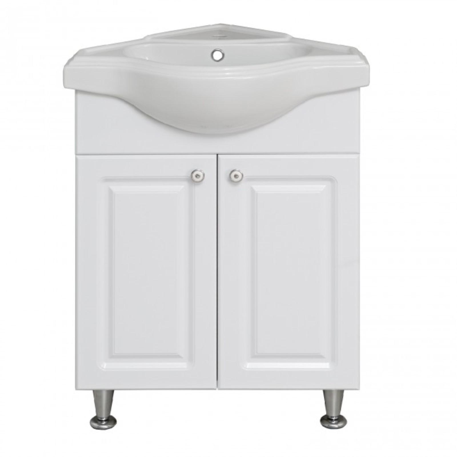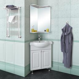 Угловое навесное зеркало с козырьком и нижней полкой. Оборудовано одним врезным светодиодным светильником 220В и розеткой с выключателем.
