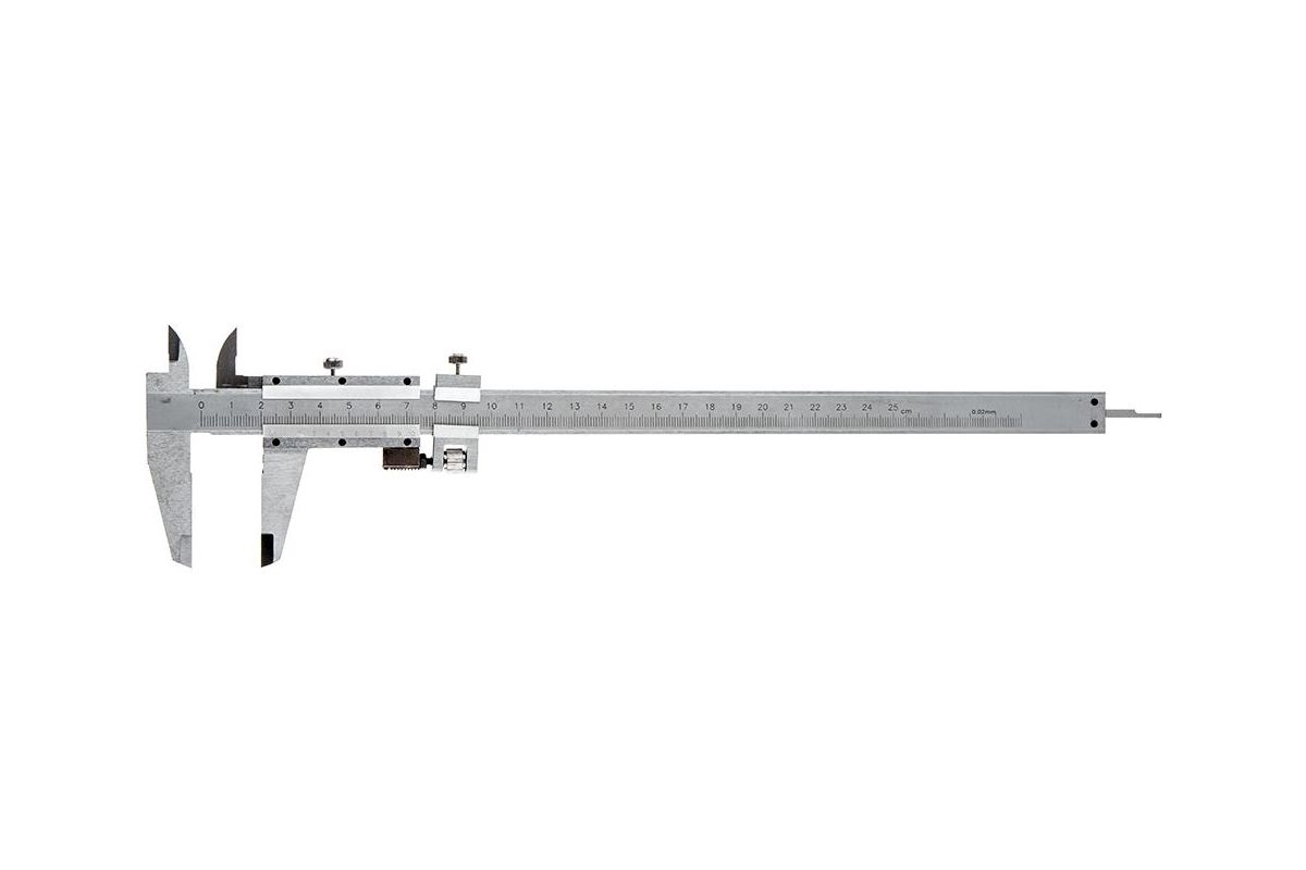 Металлический штангенциркуль с глубиномером Matrix 316335, 250 мм, со значением отсчета по нониусу 0,02 мм, используется для быстрого определения размеров внутри и снаружи деталей, а также глубин отверстий и канавок — для этого предусмотрен глубиномер. Погрешность составляет ±0,02 мм при измерении размеров до 100 мм, и ±0,03 мм — свыше 100 мм. Измерительный инструмент используется в токарном, слесарном деле, будет полезен на производственном предприятии, а также дома или в гараже.