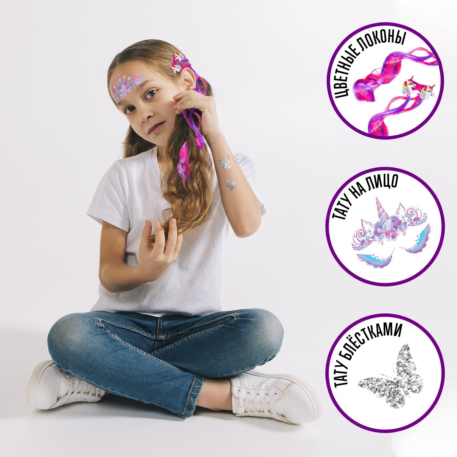 Набор детских татуировок для лица,цветных прядей и блёсток для тела «Единорожка»