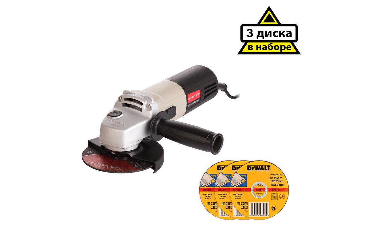 В состав набора входят: УШМ ИНТЕРСКОЛ УШМ-125/900 (42.1.0.00) 900Вт 11000об/мин 125мм, Круг отрезной DEWALT DT42240Z-QZ Ф115x22.2х1.2мм тип 1 INDUSTRIAL по металлу