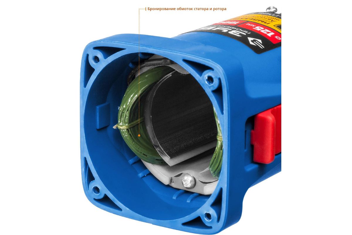 Компактная универсальная модель для эффективной работы Компактная, но при этом самая мощная модель среди одноручных машин в ассортименте ЗУБР. Очень удобна для работы в стесненных условиях Самый популярный диаметр круга 125 мм Надежная защита основных узлов от пыли: - ротор с капроновым бандажом и дополнительным слоем защитного лака; - пылезащищенный выключатель, имеющий степень защиты IP5X; - лабиринтное уплотнение всех шариковых подшипников создает непроницаемый для пыли воздушный барьер Специально разработанный корпус редуктора для улучшения теплоотвода и обеспечения прочности самого нагруженного узла Низкий уровень шума за счет редуктора с косозубыми коническими шестернями Поворотный с шагом 90 градусов корпус редуктора для настройки под левую руку или резки Защитный кожух диска с мгновенной регулировкой положения удобным рычажком Удобная блокировка шпинделя для быстрой замены диска Фланцы из разного материала предотвращают чрезмерное затягивание диска при работе Фирменная дополнительная рукоятка с обрезинкой, устанавливаемая в 2 положениях Легкое включение удобной кнопкой в одно движение Специальная конструкция щеткодержателя, предотвращающая повреждение коллектора при полном износе щеток Быстрый доступ к щеткам для замены Кабель питания с увеличенной длиной 3м в резиновой изоляции
