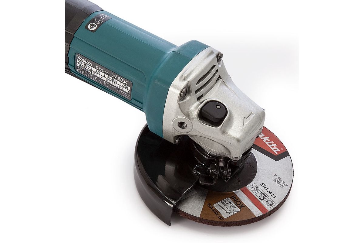 MAKITA GA5034 – угло-шлифовальная машина для зачистных, отрезных и шлифовальных работ металлических заготовок. Мощность двигателя – 720 Вт. «Болгарка» совместима с абразивными дисками 125 мм. Пригодится для обдирки старой краски, полировки, нарезки труб, арматуры и т.д.