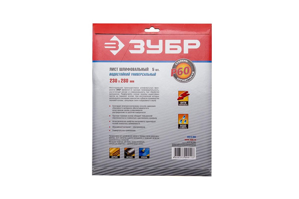 Лист шлифовальный ЗУБР 35515-060 МАСТЕР на тканевой основе водостойкий P60 230х280мм 5шт.