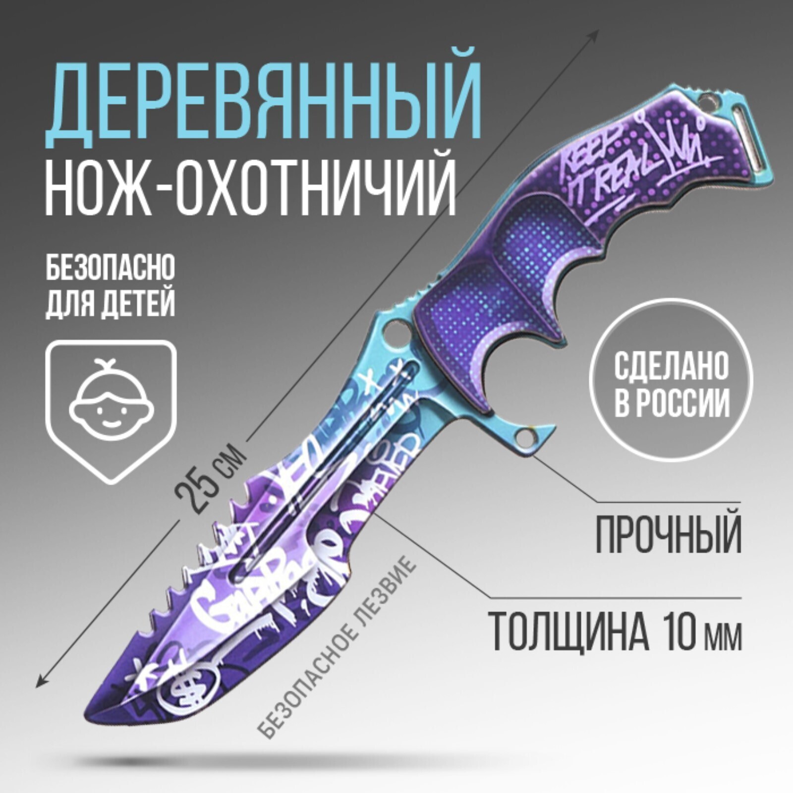 Деревянный нож охотничий «Граффити», длина 25 см - это яркое и безопасное оружие для детей!