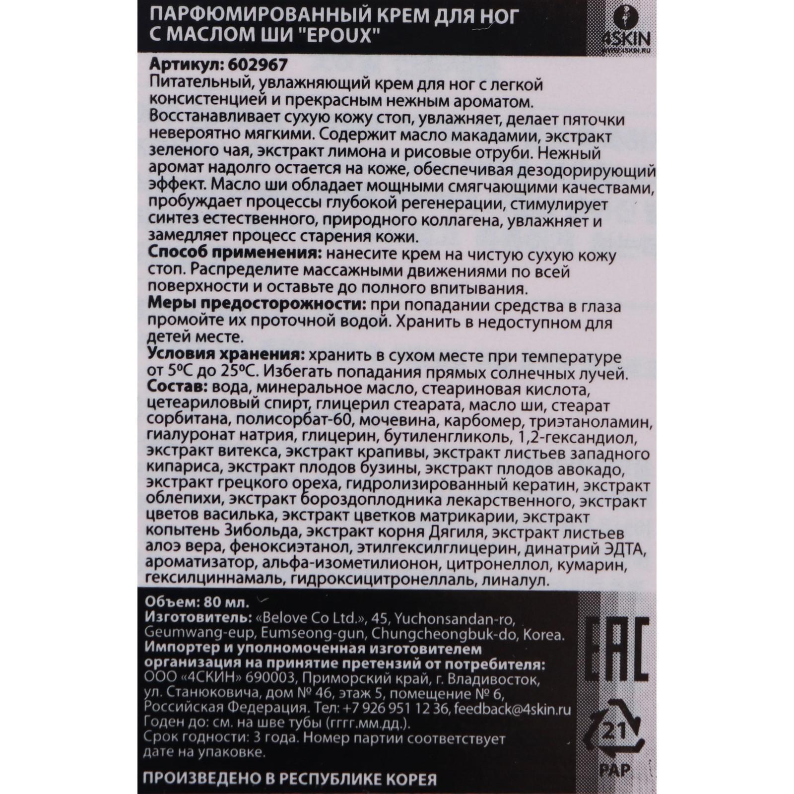 Парфюмированный крем для ног с маслом Ши Epoux с легкой текстурой и высокой скоростью впитывания обладает питательными, увлажняющими, смягчающими свойствами.