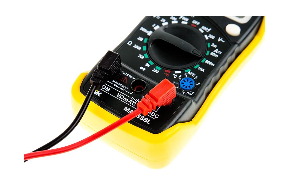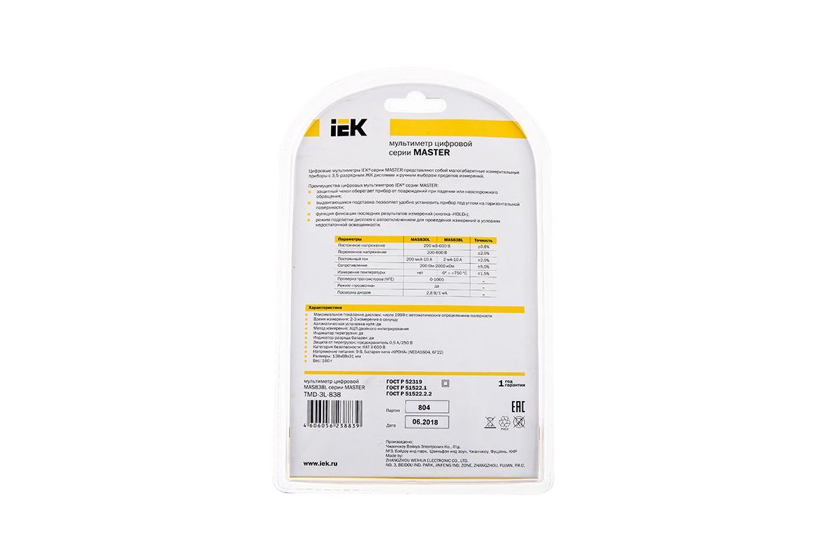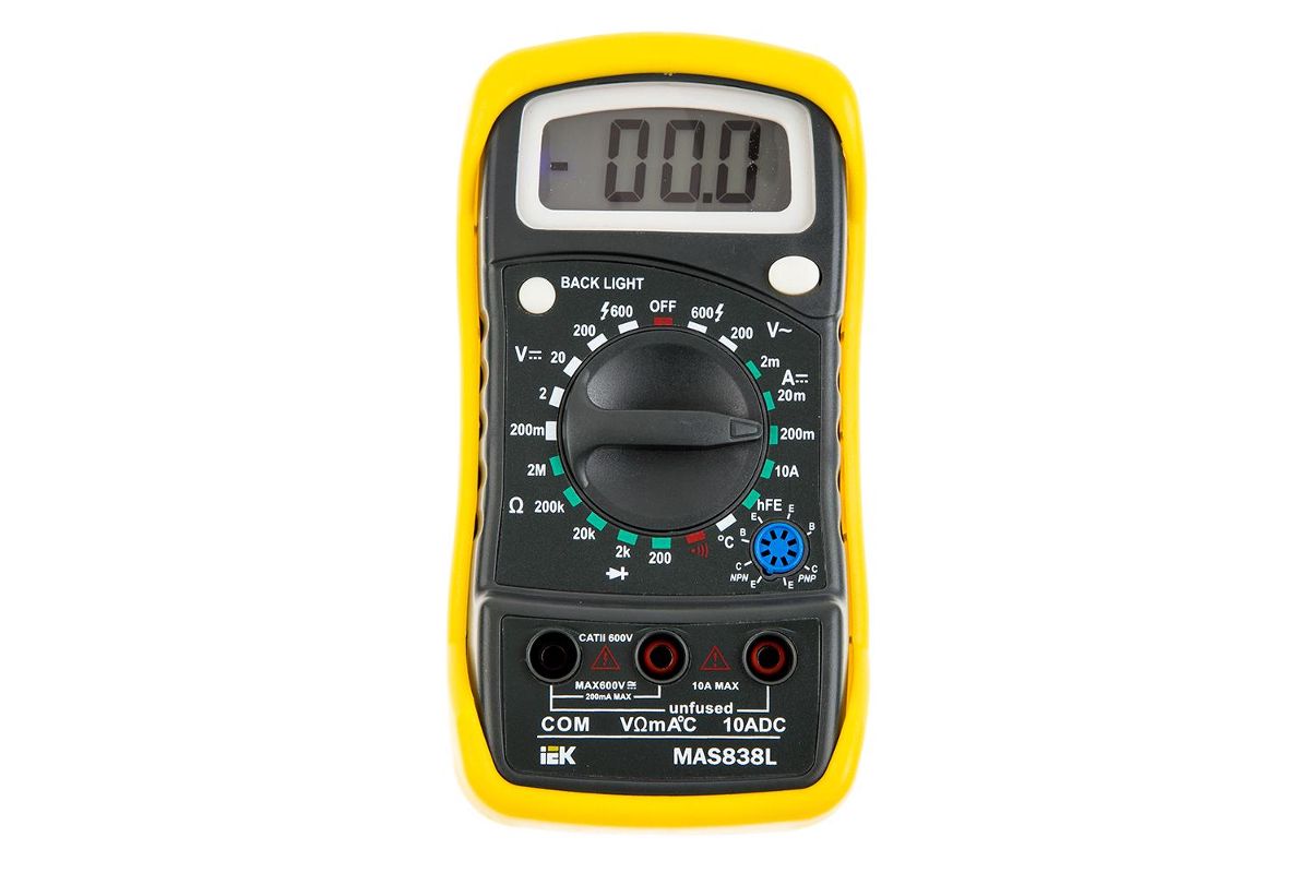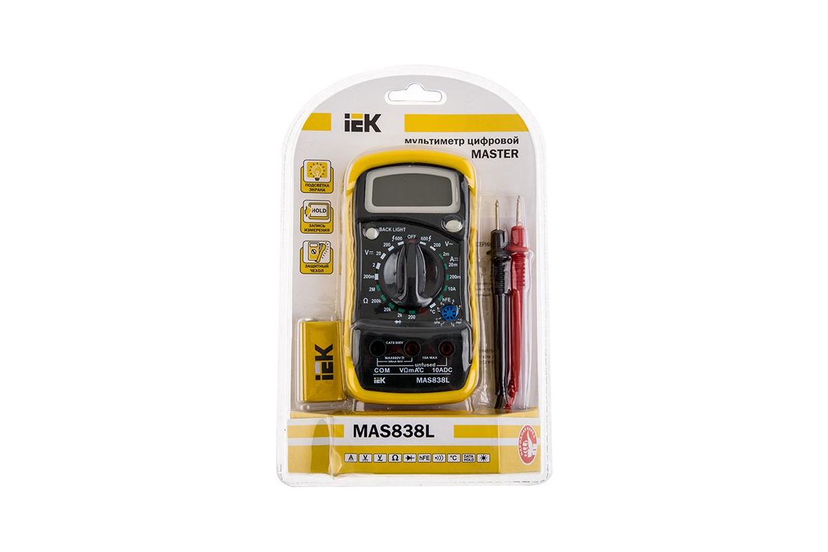 IEK Master MAS838L – профессиональный цифровой мультиметр для измерения переменного и постоянного напряжения. Вес модели – 0,36 кг. В комплекте с мультиметром поставляется его источник питания – батарея 9 В типа «Крона».