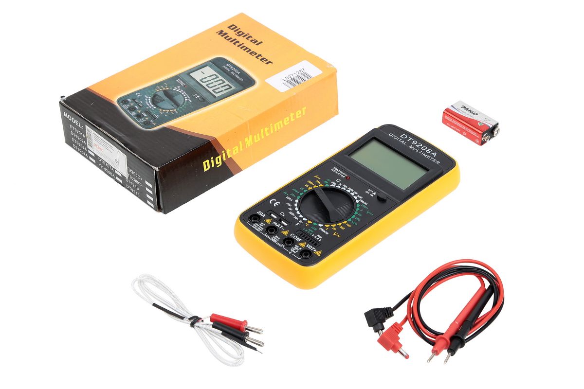 Универсальный цифровой мультиметр РЕСАНТА DT9208A подходит для измерения широкого спектра параметров. С его помощью можно определить силу и напряжение постоянного и переменного токов, измерить потенциал транзистора в качестве усилителя тока, емкость конденсатора, сопротивление проводников.