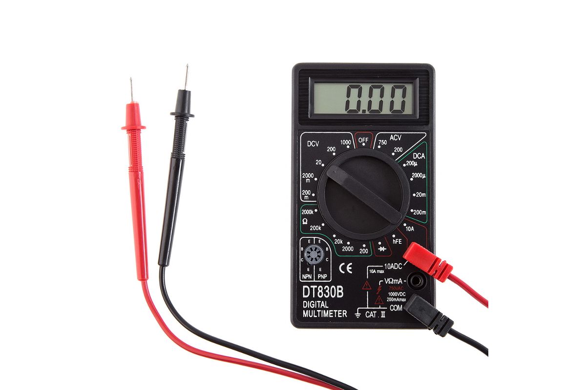 Цифровой мультимет DT830B предназначен для измерения сетевого напряжения, силы тока, сопротивления, а так же проверки диодов и транзисторов. Полярность постоянного тока и напряжения определяются автоматически. Измерения производятся с помощью двух измерительных щупов (идут в комплекте). Для отображения данных прибор оснащен ЖК-дисплеем. Для оповещения о перегрузке прибора разработана система индикации.