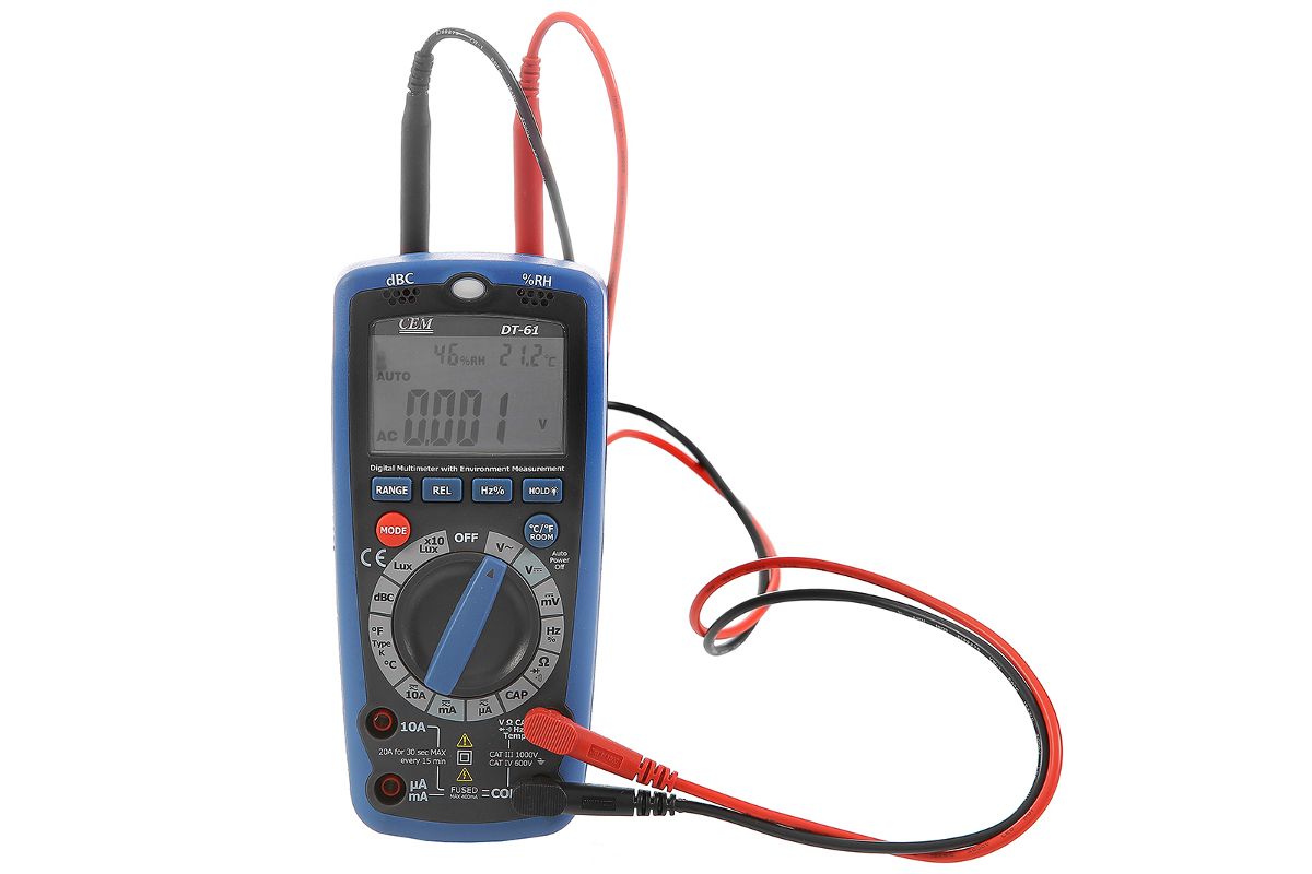 Мультиметр СЕМ DT-61 - профессиональный многофункциональный цифровой измеритель для оценки параметров окружающей среды. Модель сочетает в себе функции термометра, люксметра, влагомера, шумомера, а так же основные возможности мультиметра: тест диодов, проверку цепей, измерения сопротивления, емкости, частоты, постоянного и переменного напряжения и тока. Среди преимуществ: двойной корпус, ЖК-дисплей, функции удержания показаний и автоотключения.