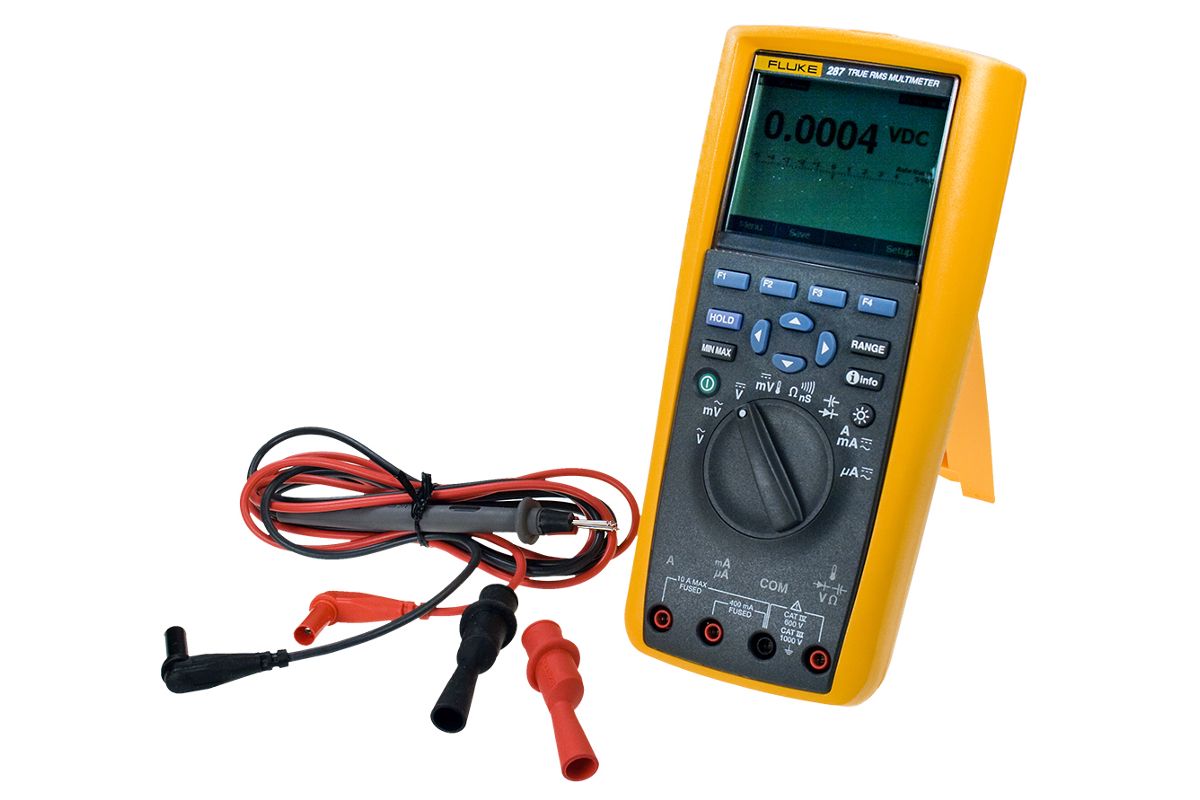 Цифровой регистрирующий мультиметр Fluke 287 измеряет постоянный и переменный ток и напряжение, сопротивление, емкость, частоту, температуру, проводимость, скважинность импульсов, а также осуществляет прозвонку цепи и проверку p-n переходов.