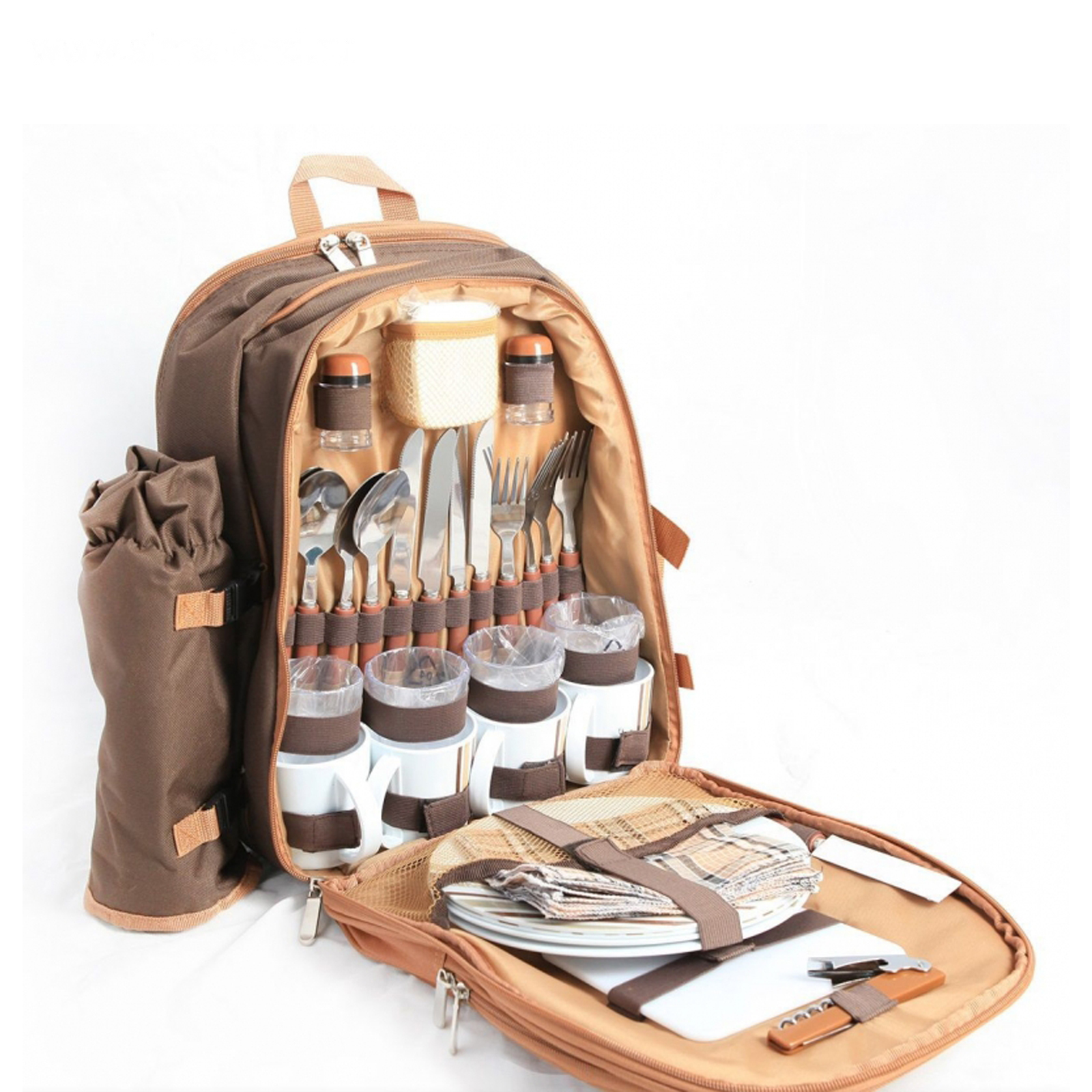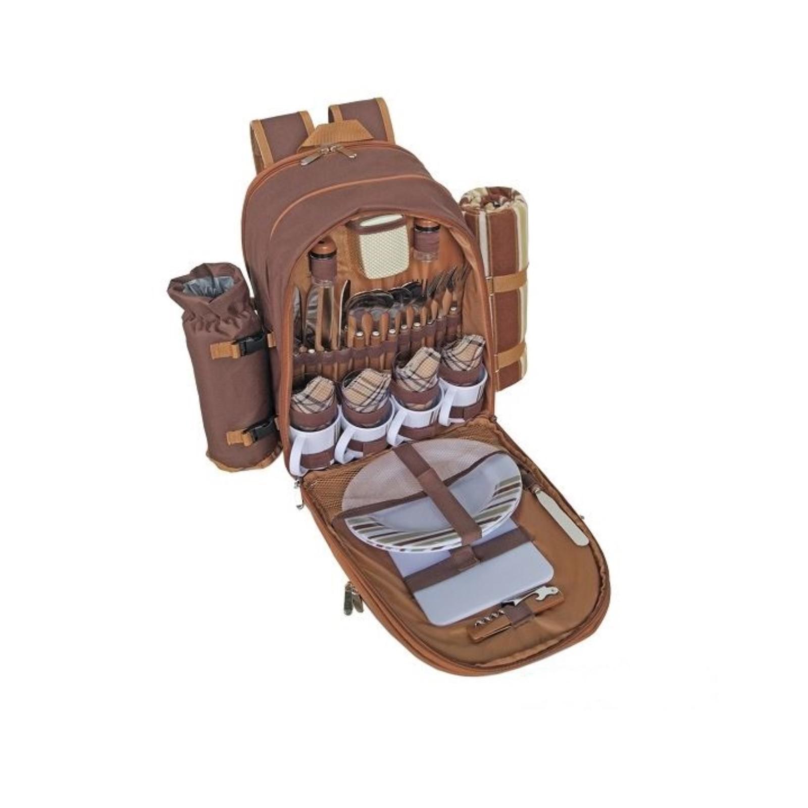Набор для пикника "Green Glade" рассчитан на 4 персоны. Предметы набора хранятся во вместительном отделении рюкзака. У рюкзака одно большое отделение с термоизоляционным слоем. Также имеются два небольших кармашка и термоизоляционный чехол для бутылки. Все отделения закрываются на застежки-молнии. Регулируемые лямки и ручки обеспечат комфортную переноску рюкзака. Все предметы набора надежно фиксируются внутри отделения специальными эластичными фиксаторами.