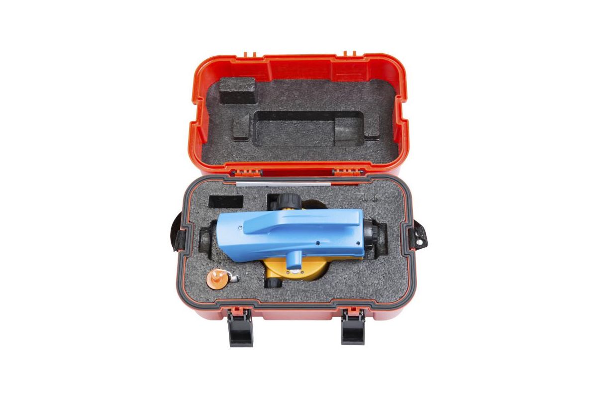 - Прибор поставляется в пластиковом кейсе в комплекте с нитяным отвесом и юстировочными инструментами.