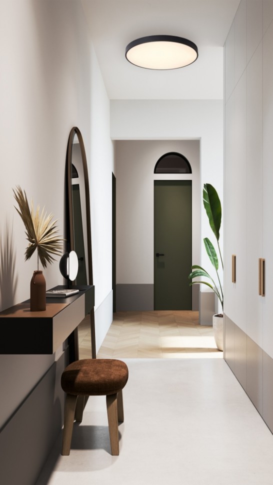 Минималистичный светодиодный потолочный светильник в черном цвете. Только мягкое рассеянное свечение, округлые формы и ничего лишнего. Светильник можно разместить в любом пространстве с квадратурой от 8 квадратных метров. В серии также есть подвесной светодиодный светильник — вместе они создадут необычную композицию в вашем интерьере.