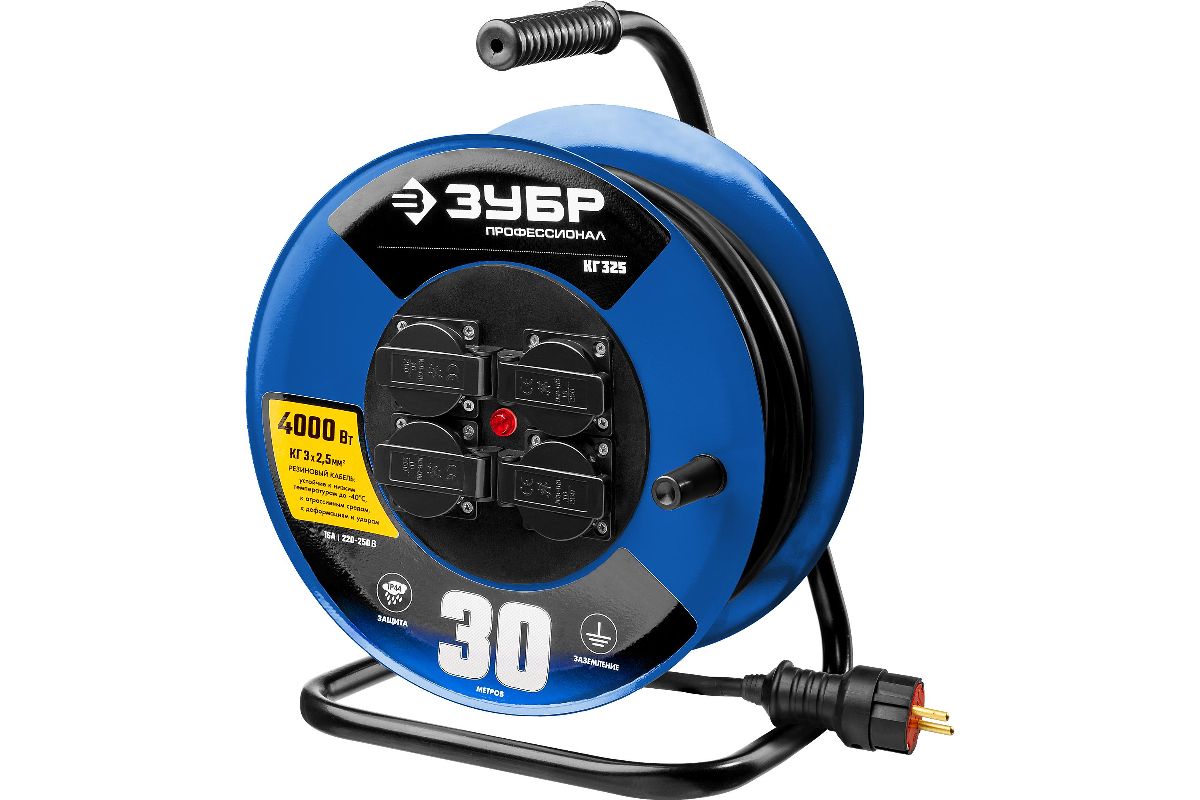 Удлинитель ЗУБР 55079-30 на катушке ''КГ 325'', 30 м, 4000 Вт, 4 а, IP44, КГ 3х2,5 кв мм