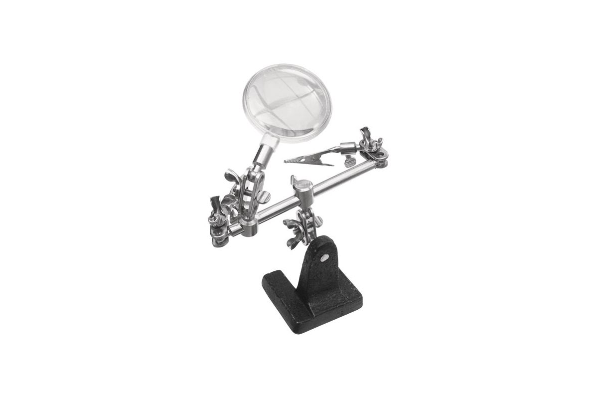 Данное устройство применяется при пайке мелких деталей. Его конструкция состоит из лупы и двух зажимов на шарнирах.