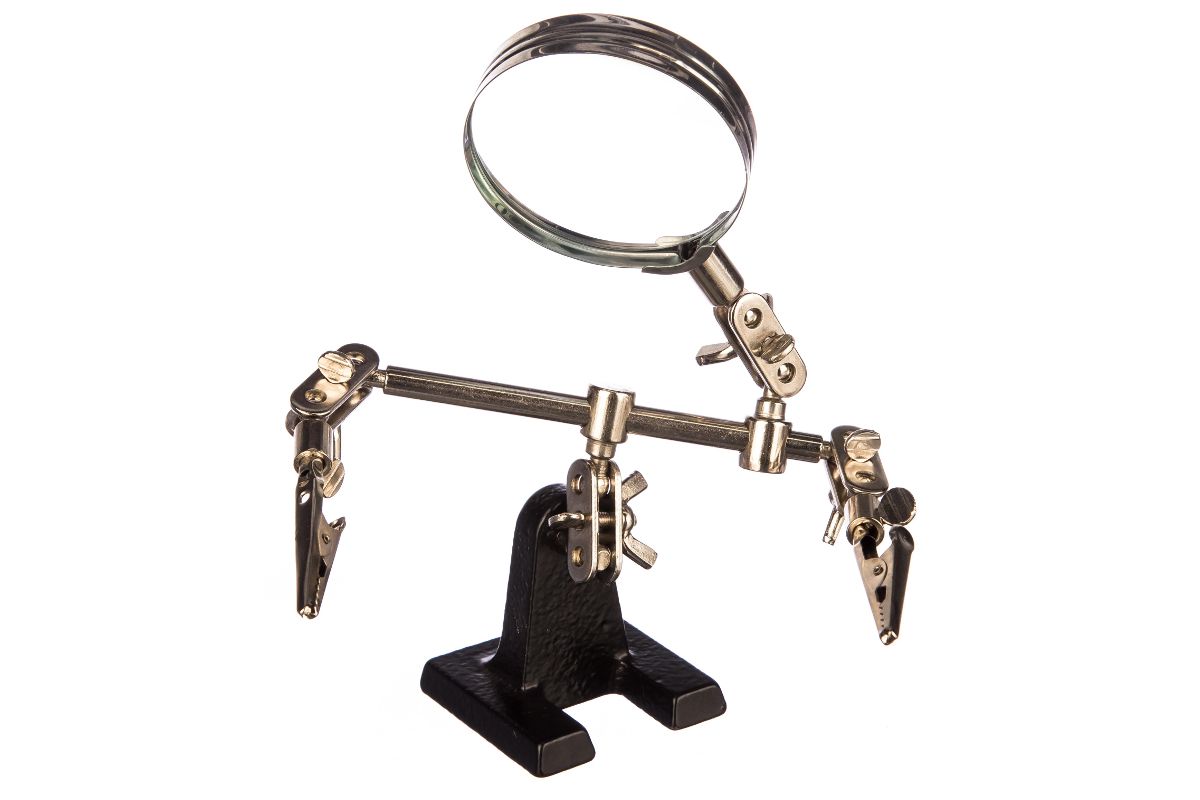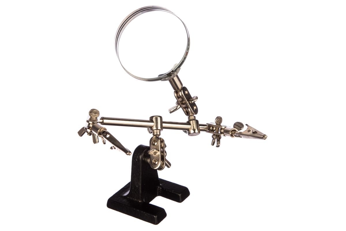 Держатель «третья рука» с лупой х3 REXANT служит, главным образом, при проведении паяльно-сборочных работ в электронике, ювелирном деле, сборке и ремонте для зажима мелких деталей в любом нужном положении, когда не хватает двух рук.