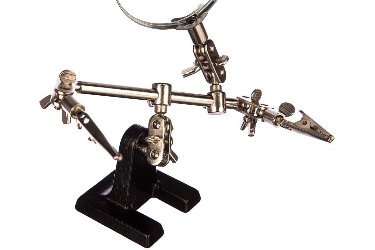 Инструмент состоит из чугунного основания (тяжелая подставка), шарнирного соединения с зажимами типа «крокодил» (подвижных во всех плоскостях) с никелевым покрытием и лупы с 3-кратным увеличением (возможность регулировки положения, диаметр линзы 60 мм).