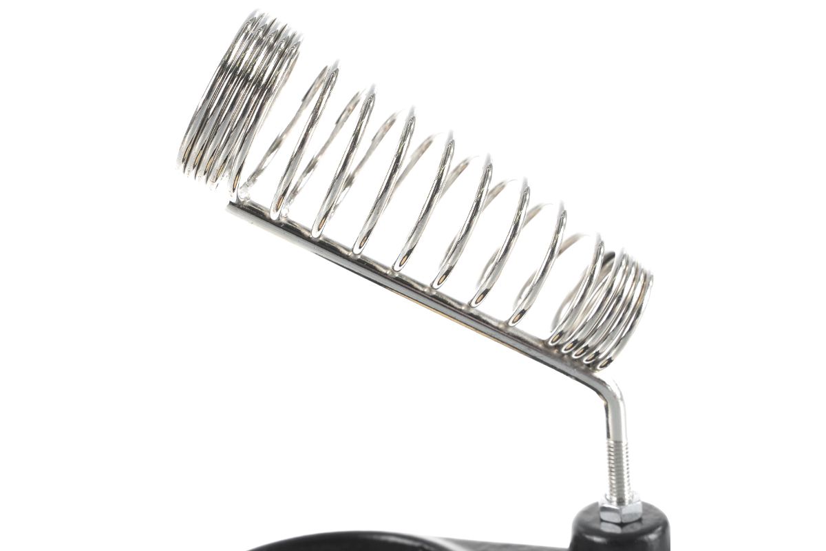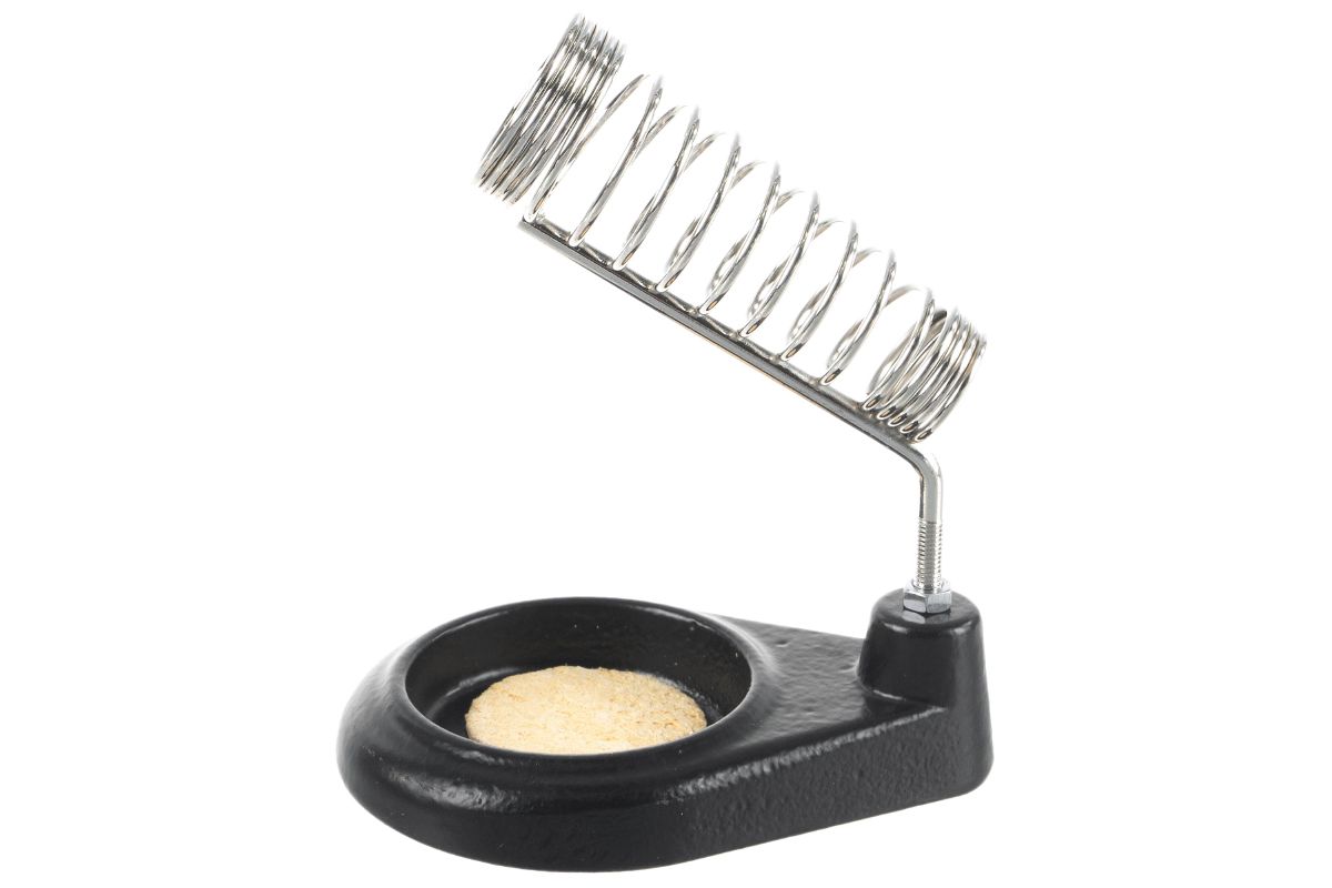 Выполнена из витой хромированной конусообразной пружины и чугунной платформы с ложементом под губку для очистки жала паяльника от остатков припоя.