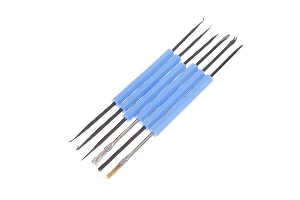 Набор для пайки (6 предметов) CT-3616 (ZD-151) REXANT предназначен для монтажных и ремонтных работ с радиоэлементами на платах, в корпусах аппаратуры, в часовых механизмах и т.п. Используется в электронике, моделировании и ювелирном деле. Ручки из качественной пластмассы не растворяются в отмывочных жидкостях. В набор входит: