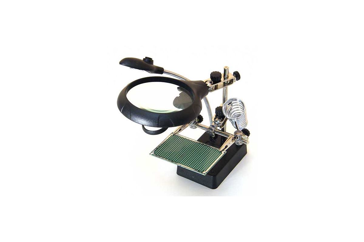 Держатель ''третья рука'' с лупой х2.5 + х7.5, подставка под паяльник, LED подсветка REXANT служит главным образом при проведении паяльно-сборочных работ в электронике, ювелирном деле, сборке и ремонте для зажима мелких деталей в любом нужном положении, когда не хватает двух рук. Инструмент состоит из основания (подставка), шарнирного соединения с зажимами типа «крокодил» (подвижных во всех плоскостях, с никелевым покрытием) и двух луп с кратностью увеличения 2.5(диам.90мм) и 7.5(диам.34мм). С помощью лупы можно будет рассмотреть даже самые мелкие детали.