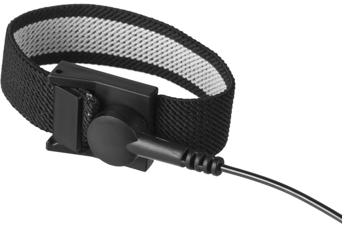 Эластичная ткань, с вплетенными проводящими электричество волокнами. изготовленными из резиново-углеродной смеси. Металлическая застежка или липучка регулируют размер манжеты и прочно закрепляют ее на руке. благодаря чему приспособление не мешает рабочему процессу. Прочный шнур заземления с зажимом для крепления к резистору.