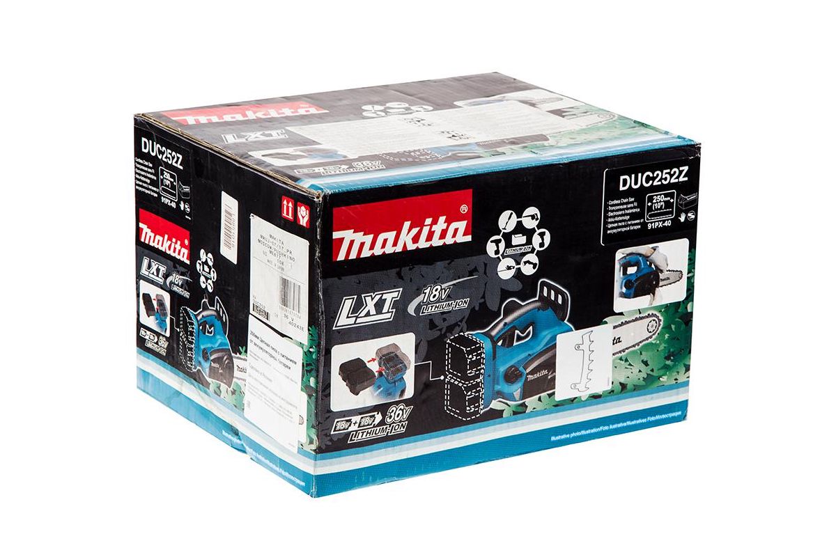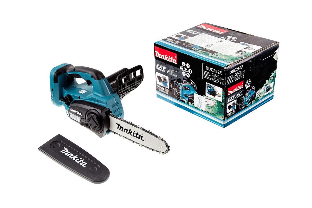 MAKITA DUC252Z – садовая аккумуляторная пила. Шина 25 см. Работает от двух Li-Ion аккумуляторов 18 В. Аккумуляторы и ЗУ не входят в комплект. Подойдёт для обрезки веток, заготовки дров и т.д.