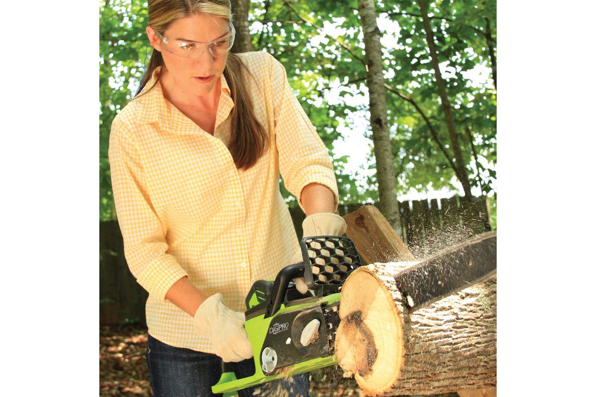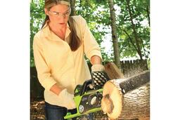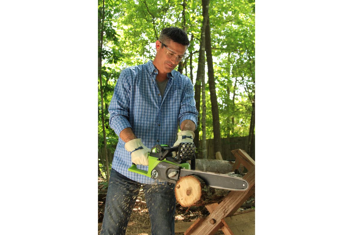 GREENWORKS GD40CS40 – аккумуляторная цепная пила для работ на загородном участке. Подойдёт для заготовки дров, обработки пиломатериалов, подравнивания сучков и валки небольших деревьев. Работает от универсального аккумулятора GREENWORKS G-MAX40.