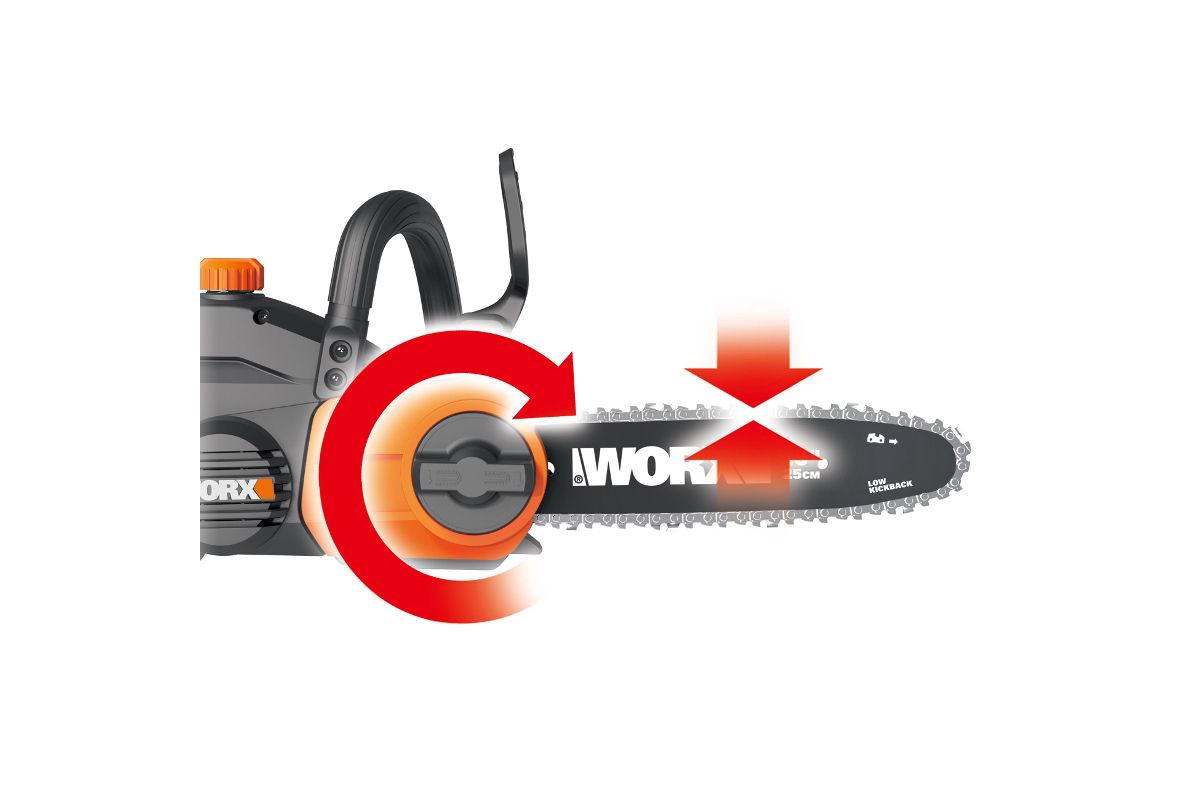 Натяжение цепи настраивается вручную, без ключа. Чтобы подтянуть её, нужно повернуть круговой регулятор.