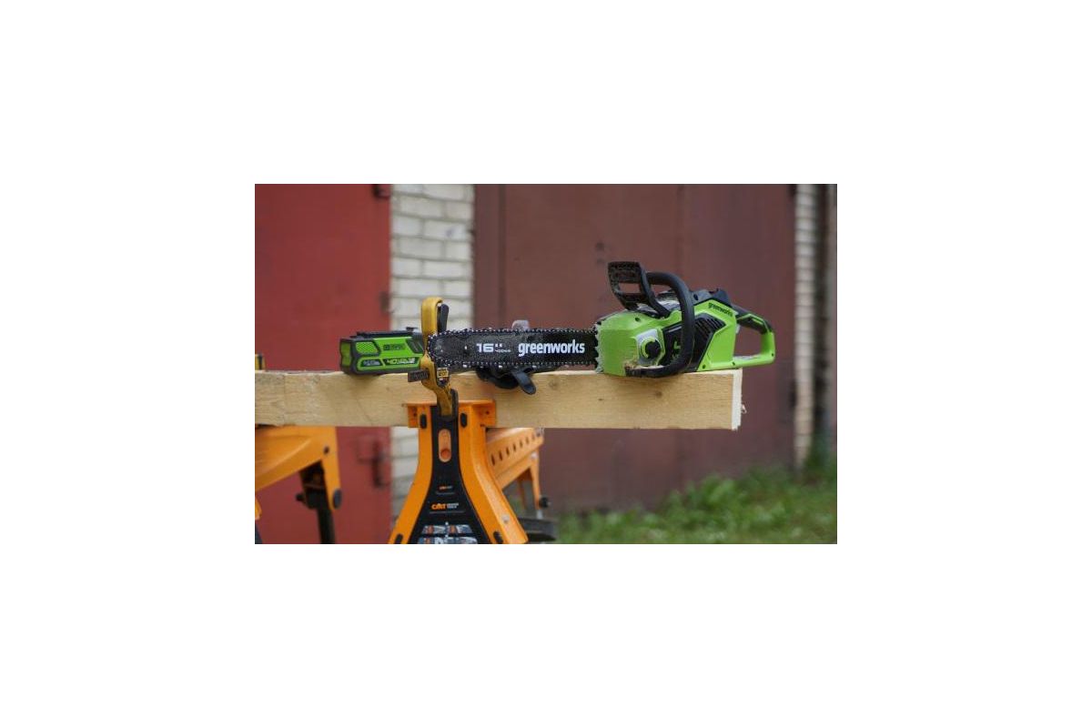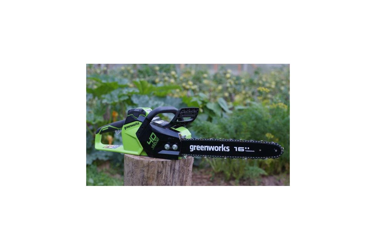 Цепная аккумуляторная пила GreenWorks - полупрофессиональная цепная пила, которая отлично подойдет для полноценного ведения дачного хозяйства. Ее надежный бесщеточный двигатель сопоставим по мощности с бензиновыми аналогами на 1,9 л/сил. При этом электродвигатель пилы GreenWorks абсолютно экологичен, имеет высокий крутящий момент (пилит быстрее бензинового аналога), имеет низкий уровень шума и вибраций, а так же прост в эксплуатации потому, что не требует подготовки масло-бензиновой смеси и какого-либо обслуживания. Включение пилы производится одной кнопкой. Замена и установка цепи не требует инструмента.