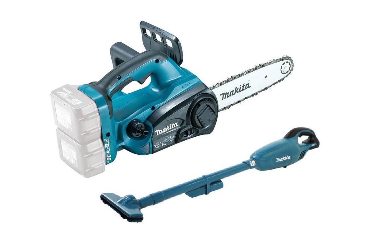В состав набора входят: Пила цепная аккумуляторная MAKITA DUC252Z 36в д\2-х ак18в li-ion шина-25см шаг-3\8'' паз-1.3мм, Пылесос MAKITA DCL180Z 18В LiIon 1300л/мин 36мбар 0.65л 1.2кг БЕЗ АКК. и ЗУ