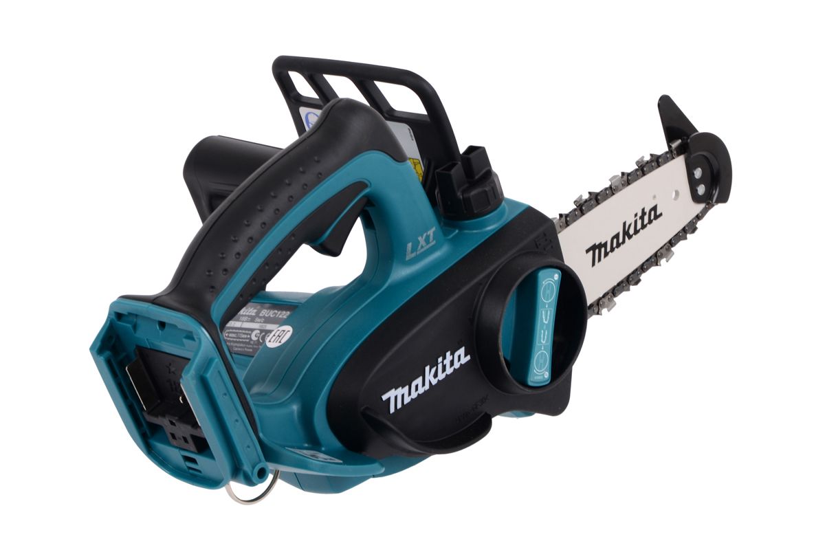MAKITA DUC122Z – аккумуляторная цепная пила для дачи и фермы. Работает от Li-Ion батареи 18 В. Аккумулятор и зарядное устройство в комплект не входят. Количество звеньев цепи – 42 шт. Длина шины 16 см. Вес 2,5 кг. Подходит для ухода за садом, работы на высоте, похода и т.д.