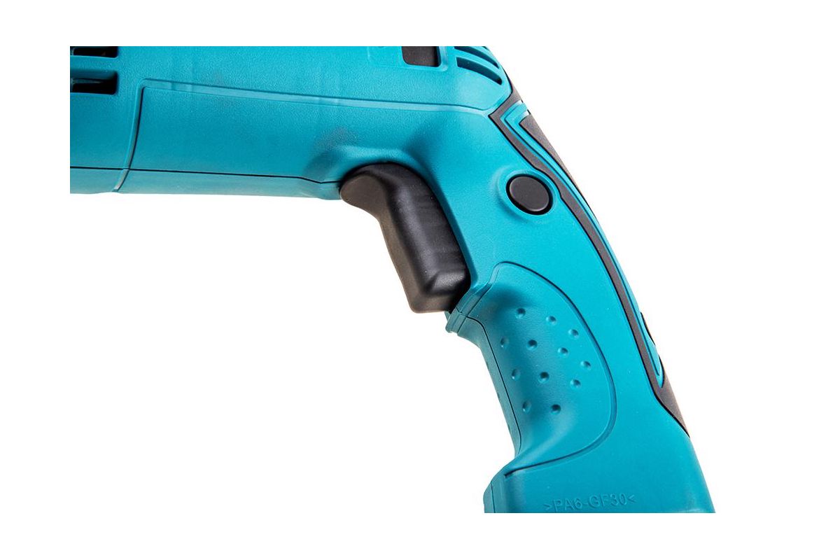 Дрель хорошо ложится в руку благодаря эргономичной основной рукоятке и дополнительной боковой. Большой курковый включатель делает работу еще более комфортной, а для беспрерывной работы предусмотрена фиксация во включенном положении. Для более точного сверления есть ограничитель глубины сверления.