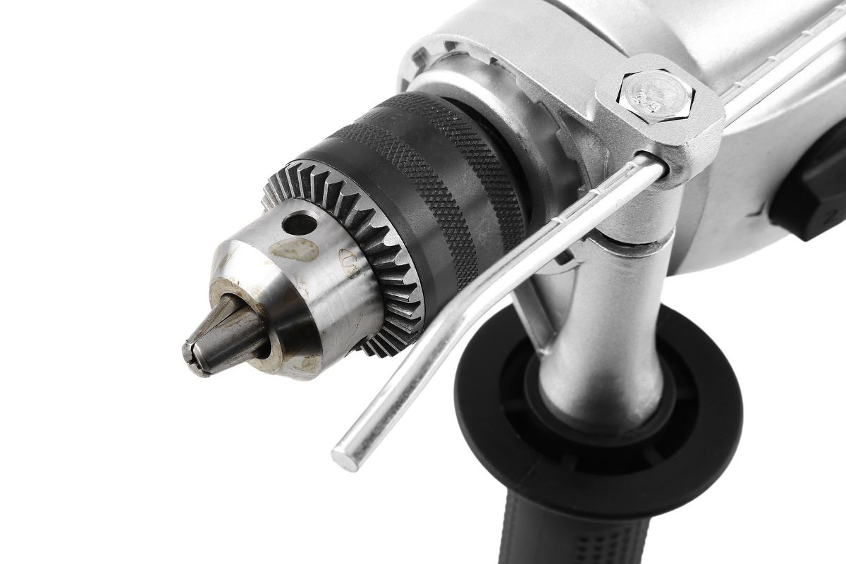 Дрель оснащена ключевым патроном, который более надежен при работе с твердыми материалами;
