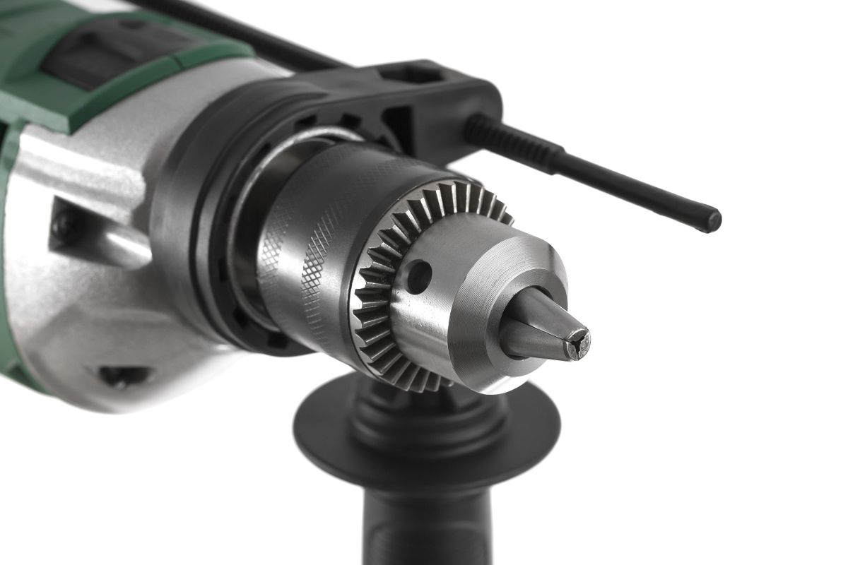 Ударная дрель с двигателем мощностью 950 Вт идеально подойдет для сверления дерева, металла и кафеля в безударном режиме, а также кирпича и легкого бетона в ударном режиме. Корпус редуктора выполнен из металла, что способствует ускоренному теплообмену и повышает прочность конструкции. Благодаря ключевому патрону обеспечивается максимально надежная фиксация оснастки. Для точной настройки инструмента в зависимости от материала предусмотрена электронная регулировка оборотов. Извлечь сверло иил вывернуть крепеж поможет встроенный реверс.