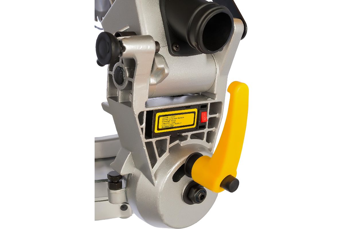 Производители позаботились о безопасном использовании инструмента. Блокировка шпинделя поможет быстро сменить пильный диск. Электронный тормоз мгновенно остановит его при необходимости. Для безопасной транспортировки инструмента предусмотрена фиксация пилы в опущенном положении.