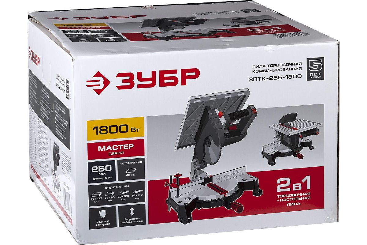 Пила торцовочная ЗУБР ЗПТК-255-1800 Мастер – комбинированная модель, предназначенная для продольного и поперечного пиления прямо, под наклоном, косо и комбинированным способом. Мощность 1800 Вт. Обороты 4500 об/мин. Она сочетает в себе преимущества торцовочной и настольной циркулярной пилы.