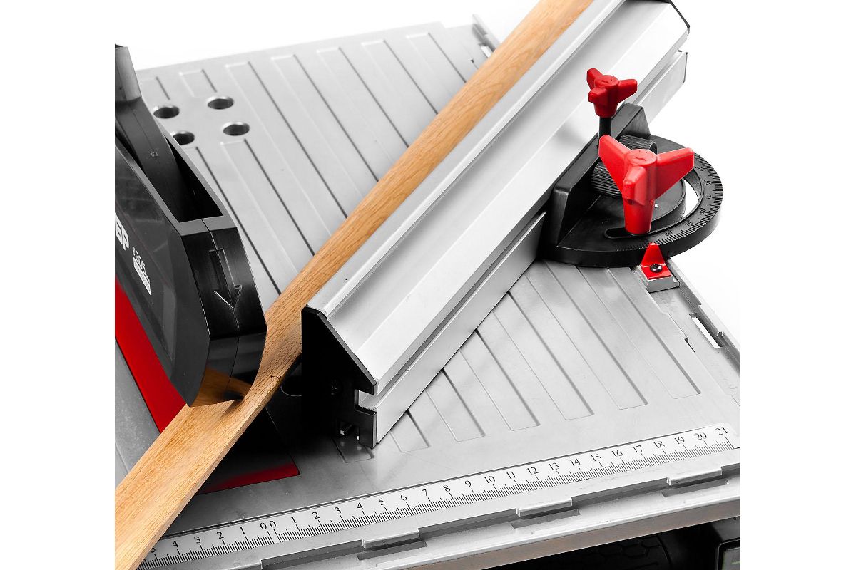 Удлинители стола, регулировка углового и продольного упора позволяют хорошо зафиксировать заготовку во время пиления.