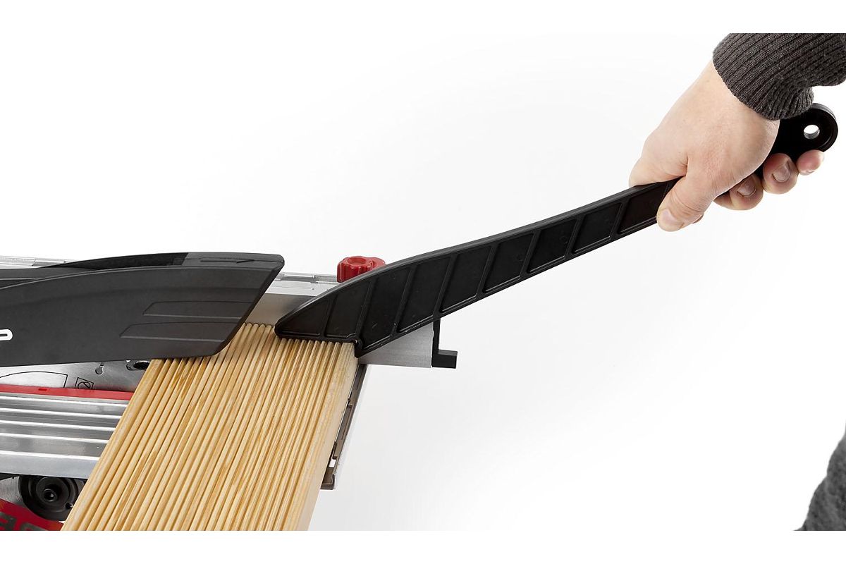 Линейка на упоре облегчает пропил на заданный размер. Удобно работать без карманной рулетки или дополнительной линейки.