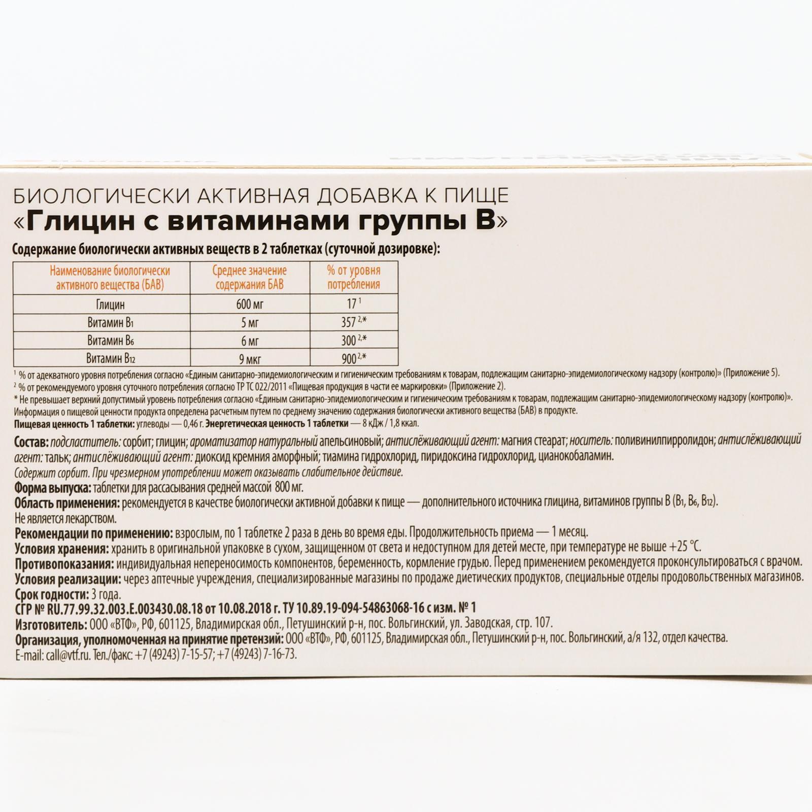 Состав: подсластитель: сорбит; глицин; ароматизатор натуральный апельсиновый; антислёживающий агент: магния стеарат; носитель: поливинилпирролидон; антислёживающий агент: тальк; антислёживающий агент: диоксид кремния аморфный; тиамина гидрохлорид, пиридоксина гидрохлорид, цианокобаламин.