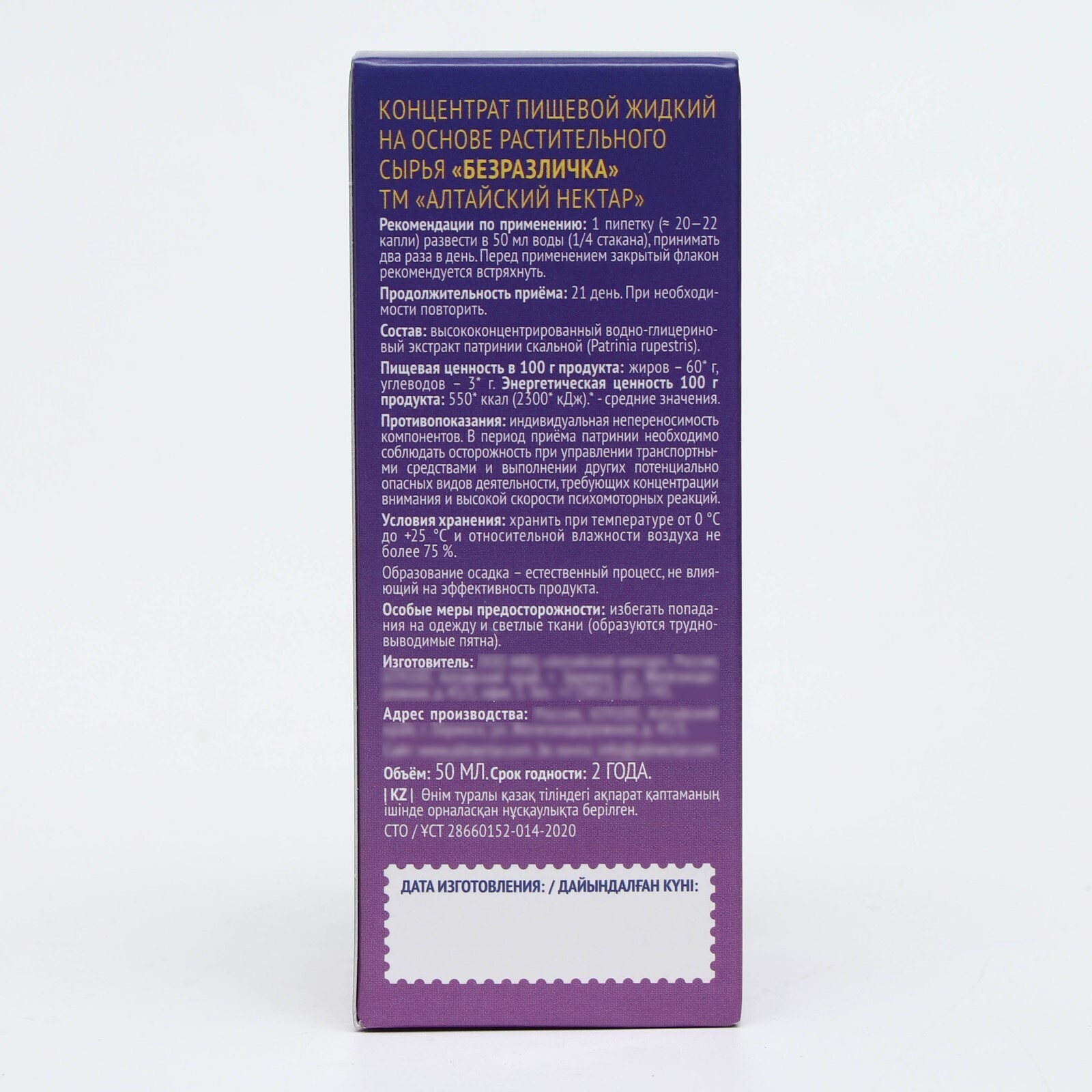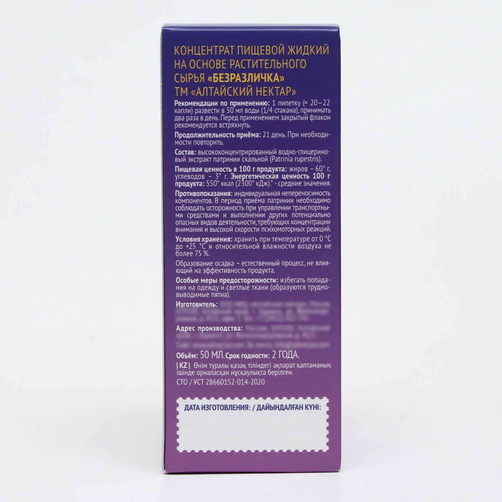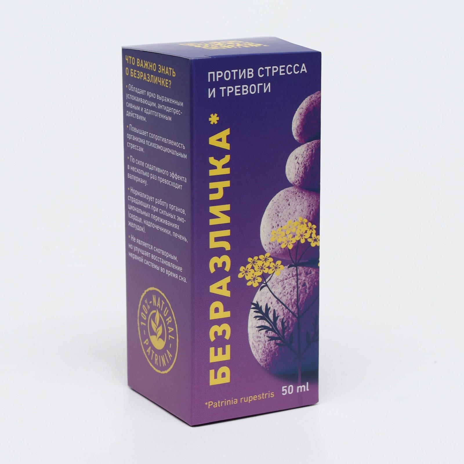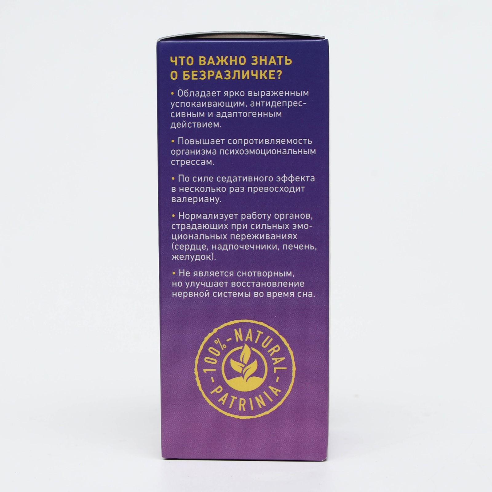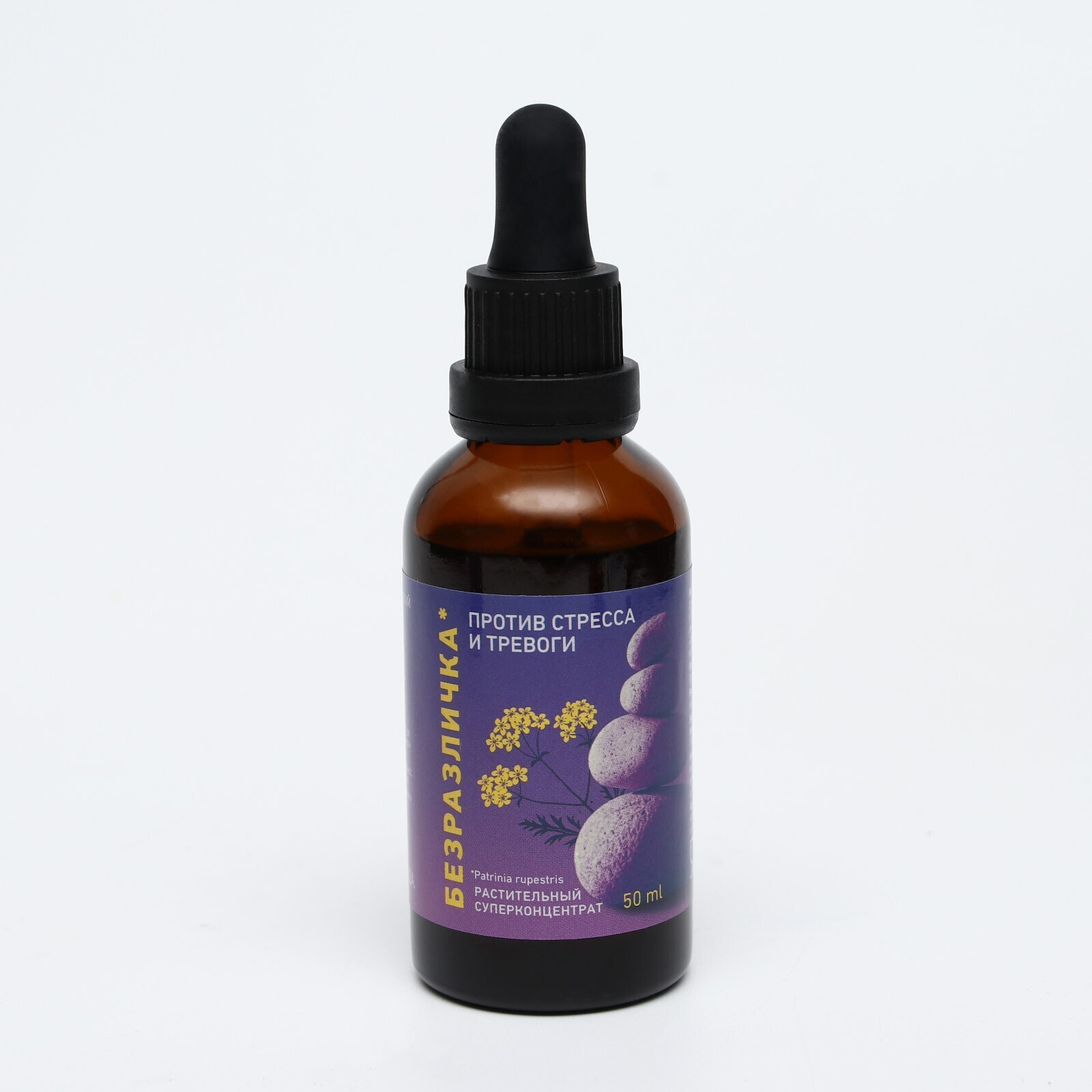 Суперконцентрат "БЕЗРАЗЛИЧКА" (против тревоги и стресса) — благодаря входящему в его состав экстракту Патринии скальной, оказывает выраженное успокаивающее действие, способствует нормализации сна, повышает сопротивляемость организма стрессам.
