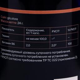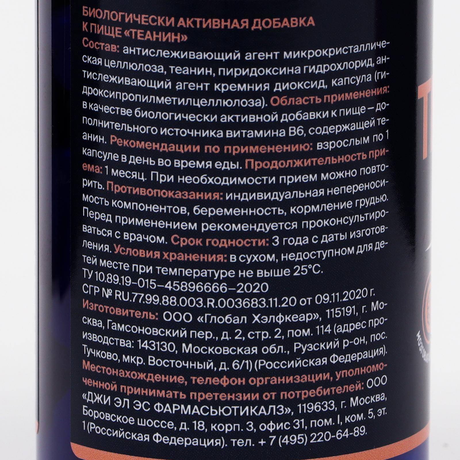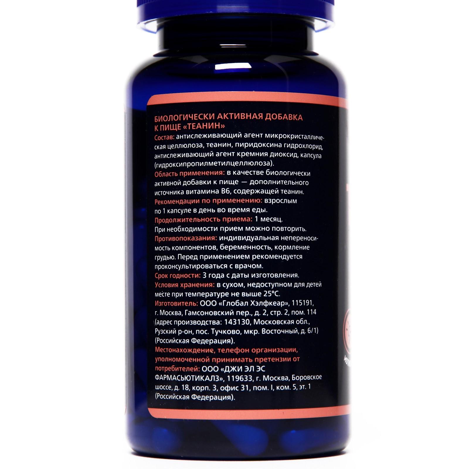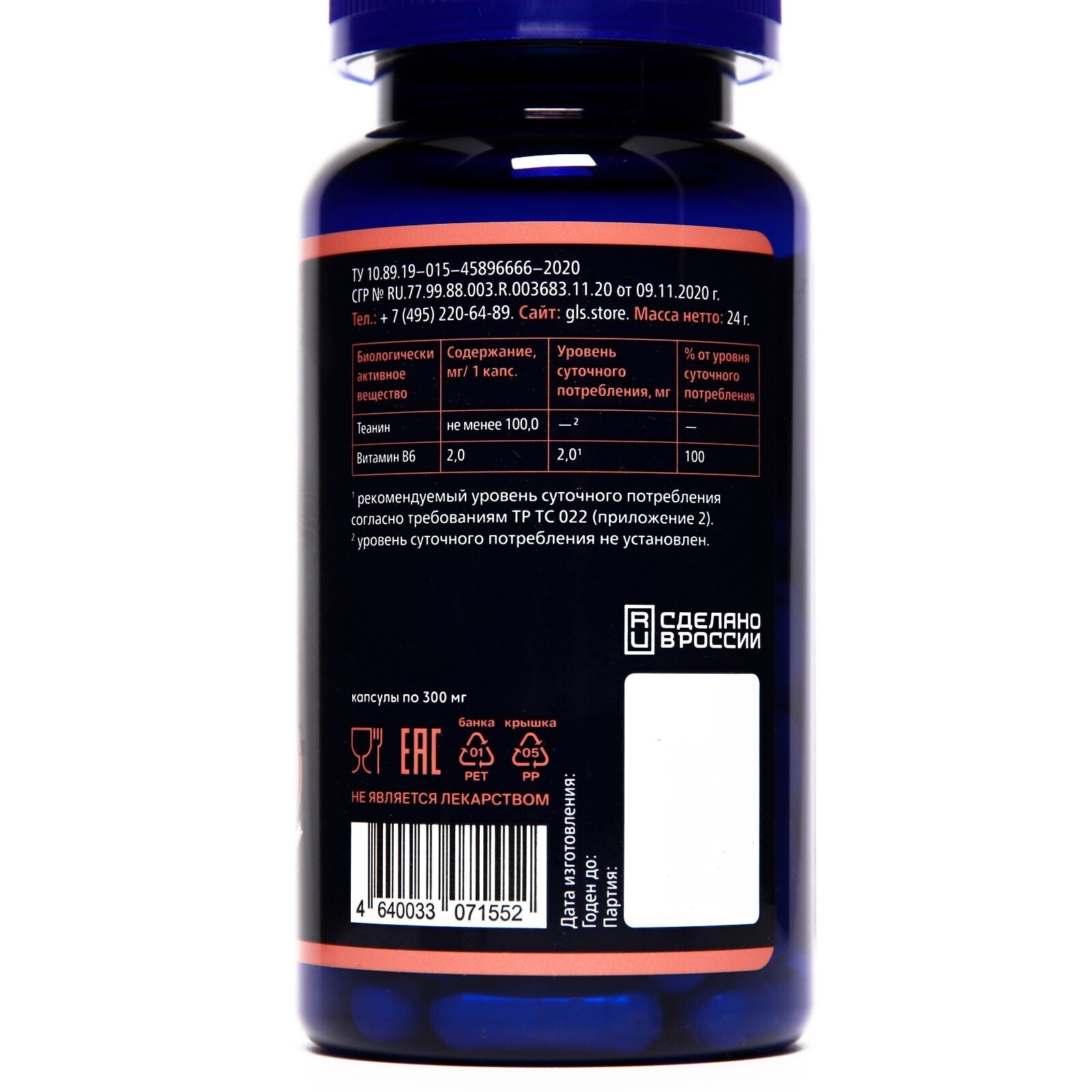 Состав: антислеживающий агент микрокристаллическая целлюлоза, теанин, пиридоксина гидрохлорид, антислеживающий агент кремния диоксид, капсула (гидроксипропилметилцеллюлоза).