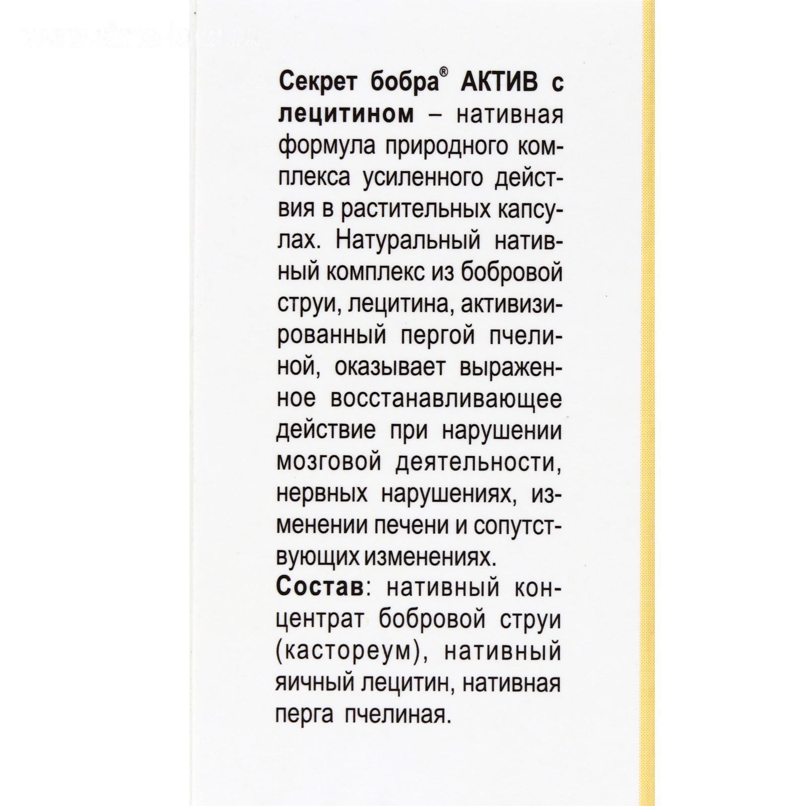 «Секрет бобра» с лецитином – нативная формула природного комплекса усиленного действия в растительных капсулах. Натуральный нативный комплекс из бобровой струи, лецитина, активизированный пергой пчелиной, оказывает выраженное восстанавливающее действие при нарушении мозговой деятельности, нервных нарушениях, изменении печени и сопутствующих изменениях.